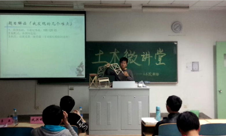 2014年4月14日晚6:30,土木微讲堂第一讲在河海大学江宁校区致用楼举行。本次微讲堂主题为“结构大赛经验分享”,主讲人是曾参加全国、华东杯和江苏省结构竞赛的2010级土木工程专业李强同学、2011级土木工程专业学生线洪鹤和李显同学。有30多名土木院的2012级同学聆听了讲座。