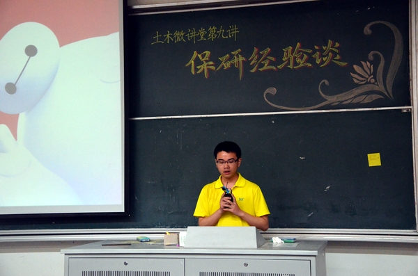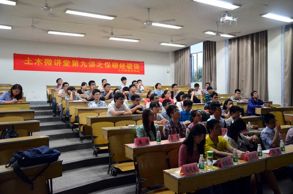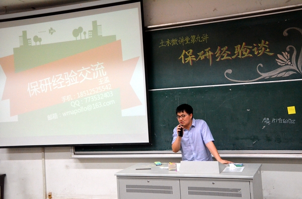 2015年4月28日晚,土木与交通学院“土木微讲堂”第八讲之保研经验谈在北教303正式开讲。本次土木微讲堂的主讲人为土木院2011级本科生马志东、毋佳玉、孔祥明、李倩、曾鹏、王孟。吴昊老师、王璐老师和2012级部分本科生参加了本次讲座。