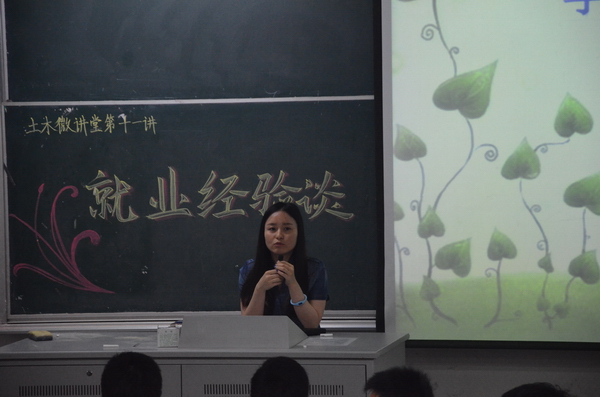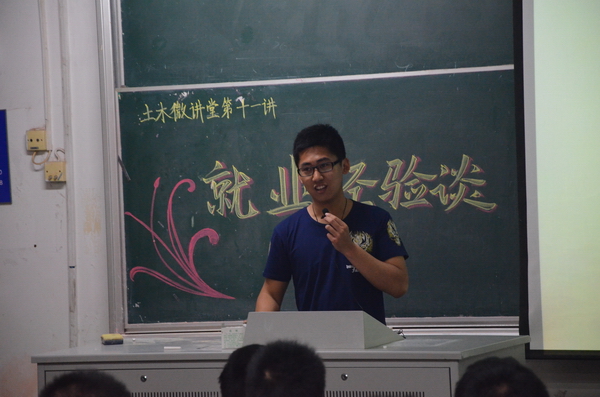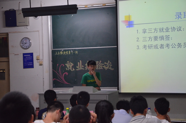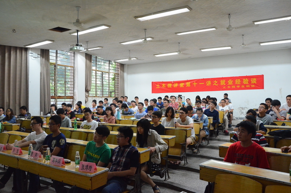 2015年5月18日晚,土木与交通学院“土木微讲堂”第十一讲之就业经验谈在北教104正式开讲。本次土木微讲堂的主讲人为11级土木工程专业、交通工程专业本科生张博琦、葛丰润、曹阳、肖克,2012级部分本科生参加了本次讲座。