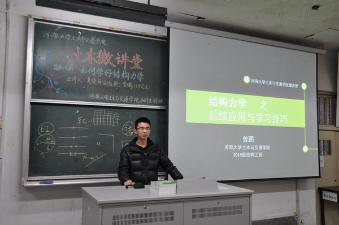 2015年12月9日下午两点,土木与交通学院“土木微讲堂”第十八讲之“如何学好结构力学”暨学院赠2013级同学专业书籍仪式在本部北教104成功举办。本次微讲堂邀请了工程力学研究所副所长夏晓舟副教授和结构研究所15级优秀研生曾鹏同学作为主讲人,为学院2013级的同学们分享结构力学的学习方法。