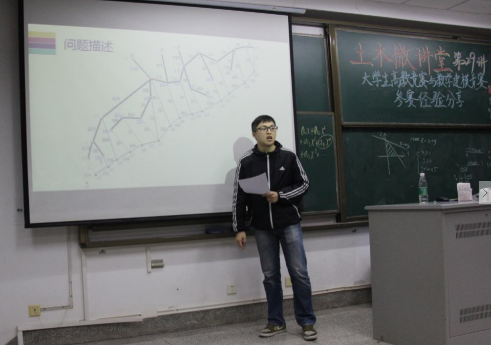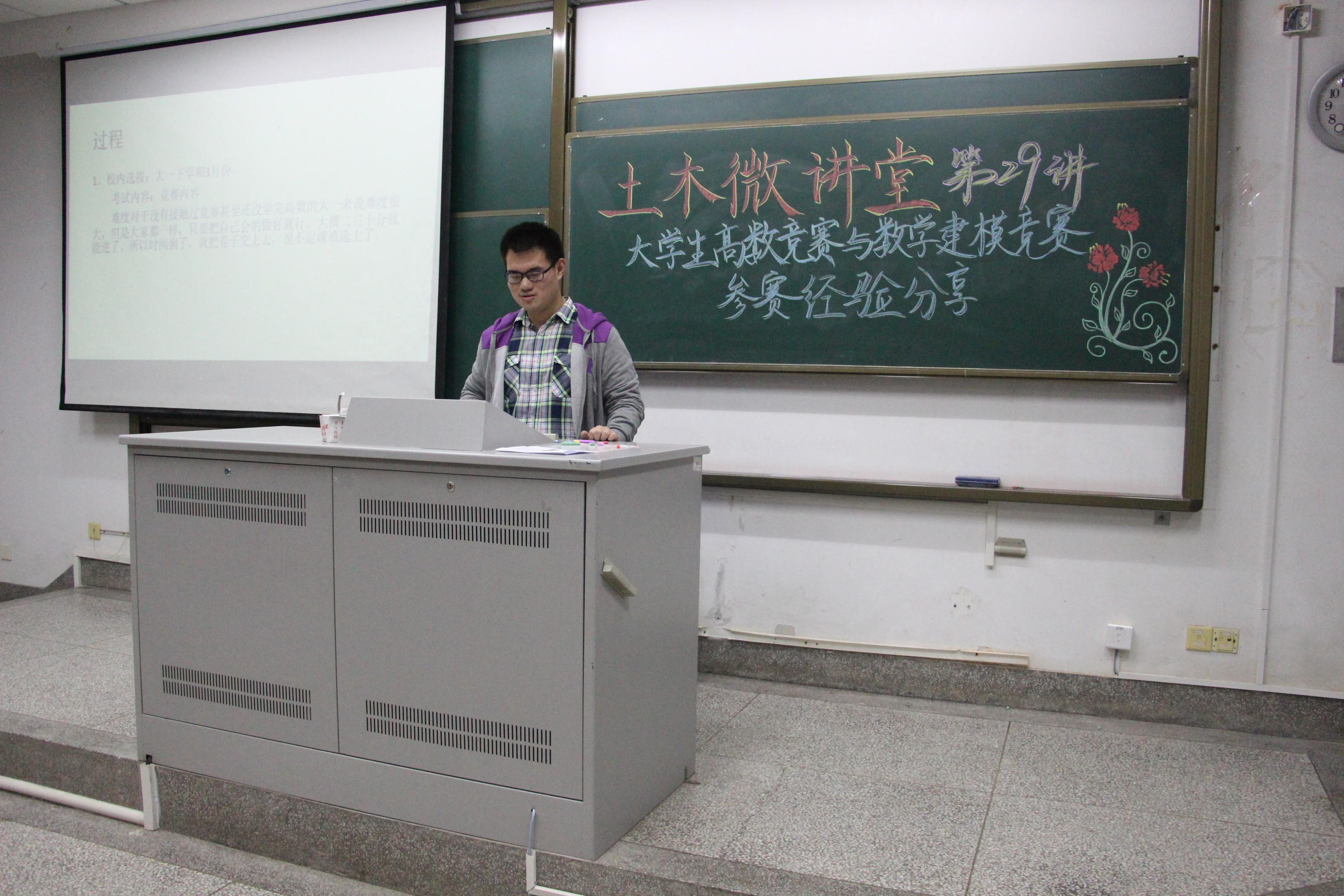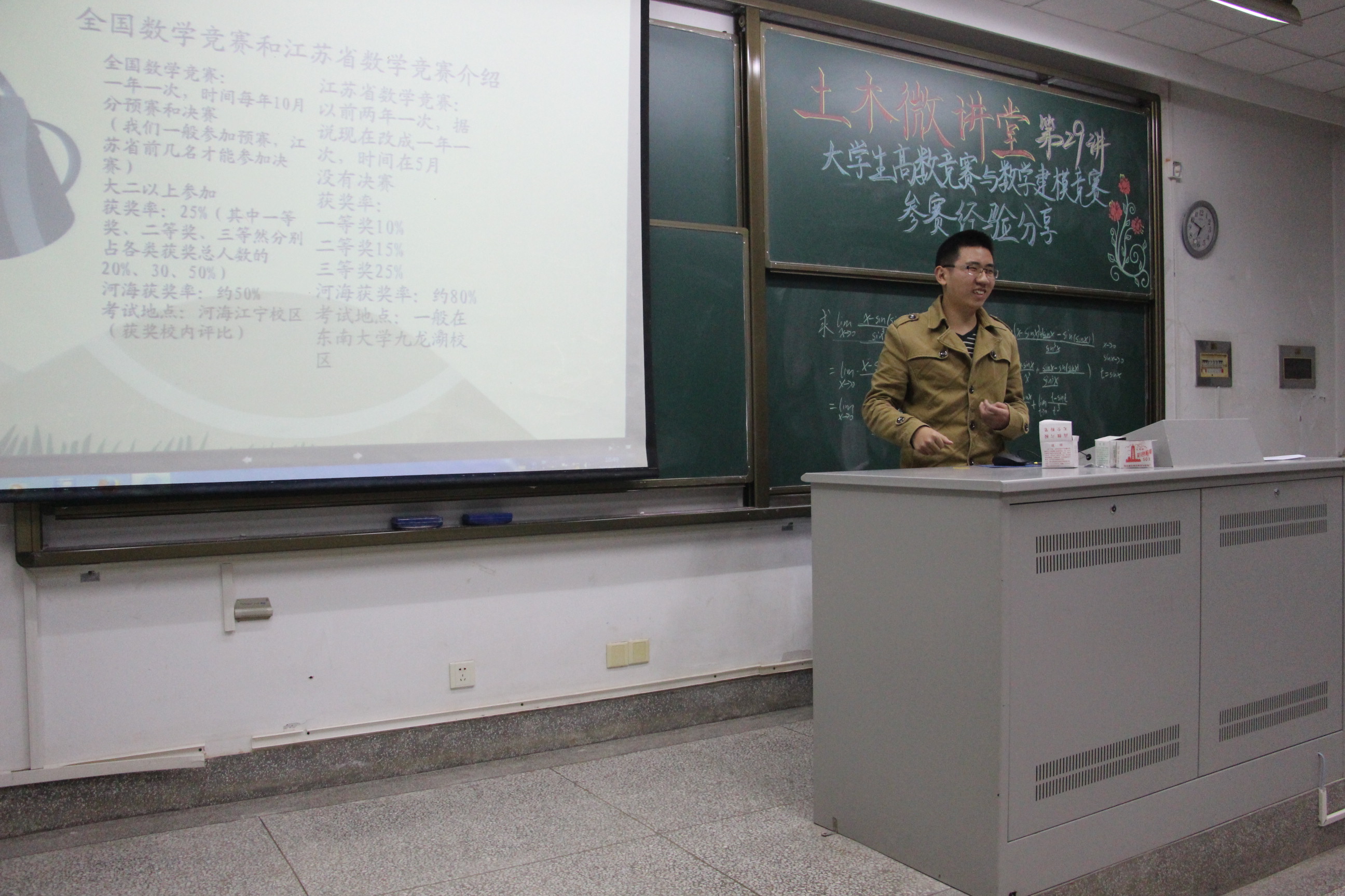 2016年11月4日,由土木与交通学院主办,土木与交通学院本科生科协承办的“土木微讲堂”之第二十九讲“大学生高数竞赛与数学建模竞赛参赛经验分享”在江宁校区致用317成功举办。本次微讲堂邀请到了获得全国大学生数学建模一等奖和美国大学生数学建模二等奖的2013级土木专业张协力同学、获得江苏省大学生数学竞赛一等奖的2014级土木专业周若愚同学以及获得江苏省大学生数学竞赛一等奖的2015级曾豪同学,担任主讲人。土木与交通学院2015级和2016级部分同学聆听了本次讲座。