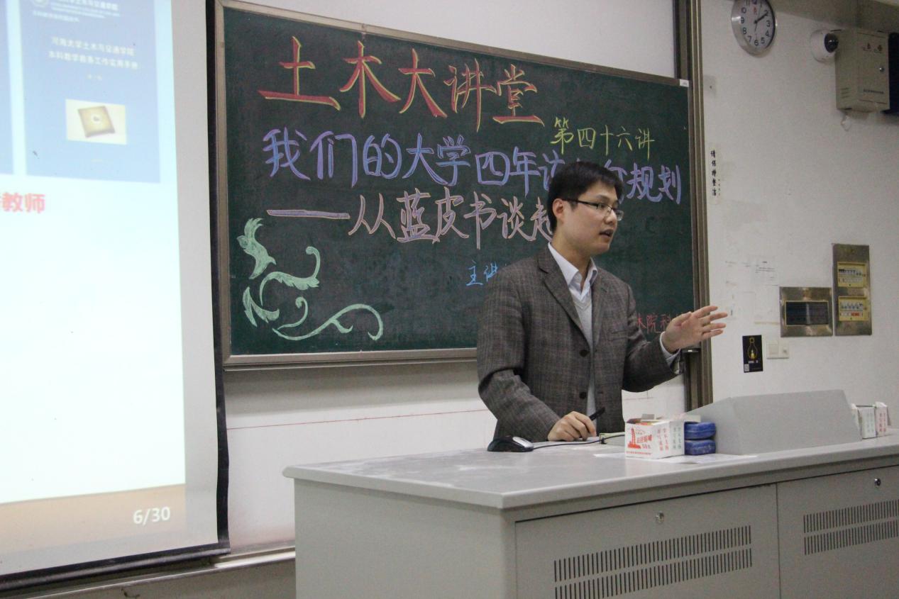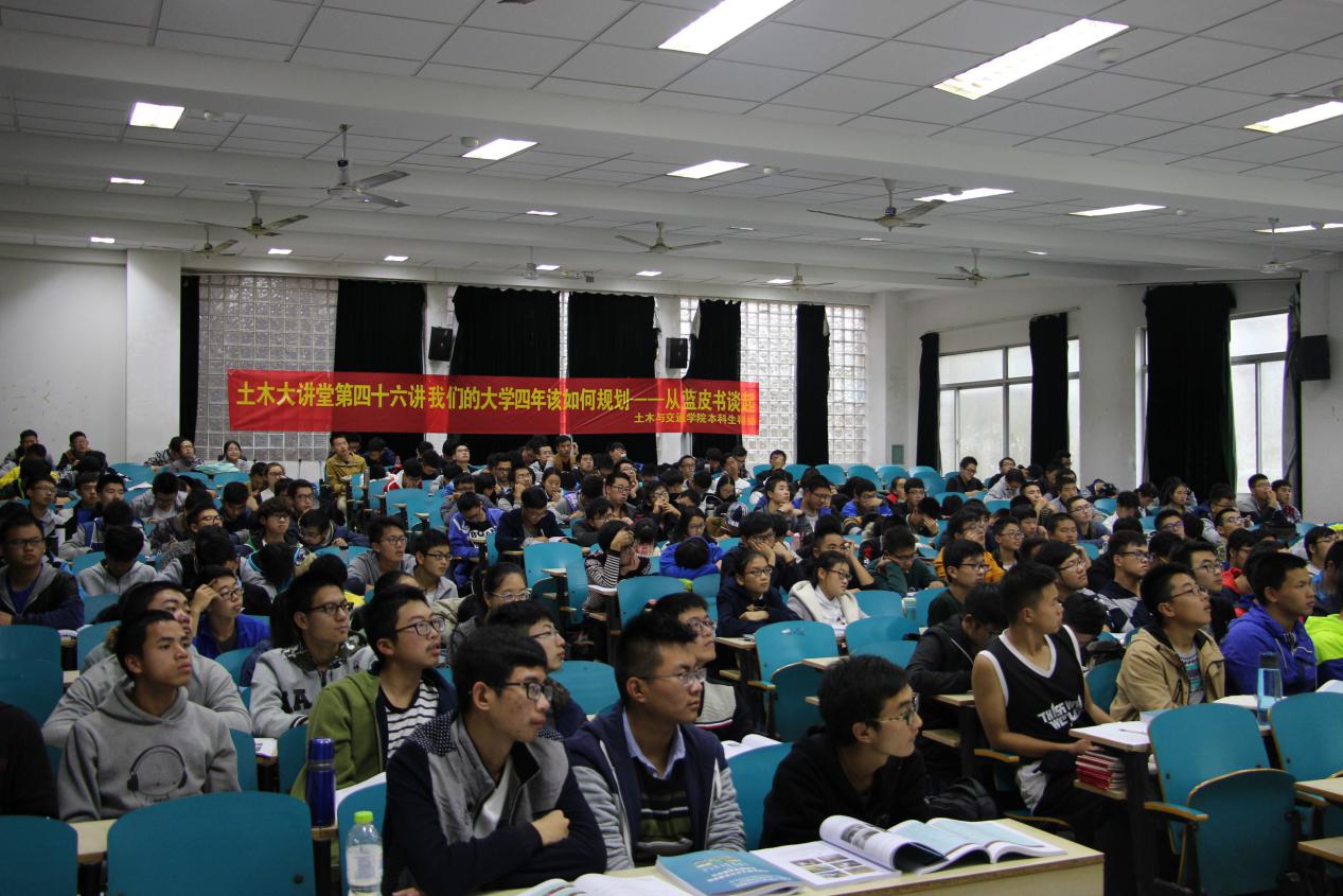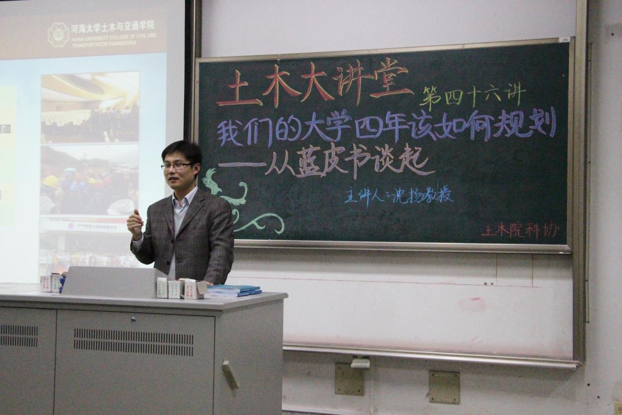 2016年11月7日下午2:00,由土木与交通学院本科生科协承办的土木大讲堂第四十六讲之“我们的大学四年该如何规划—从蓝皮书说起”在致高楼B111成功举行,本次大讲堂的主讲人是土木与交通学院副院长,博士生导师沈扬教授。16级土木与交通学院辅导员陈明明老师及土木与交通学院全体16级本科生聆听了这次讲座。