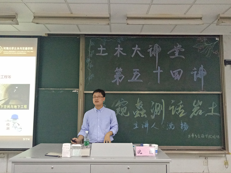 2017年9月25日下午3:50,由土木与交通学院主办,学院本科生科协承办的土木大讲堂第五十四讲之“管窥蠡测话岩土”在河海大学江宁校区致用楼101教室成功举行。本次大讲堂的主讲人是土木与交通学院副院长沈扬教授,土木院16级辅导员陈明明老师以及16级全体同学们聆听了本次讲座。