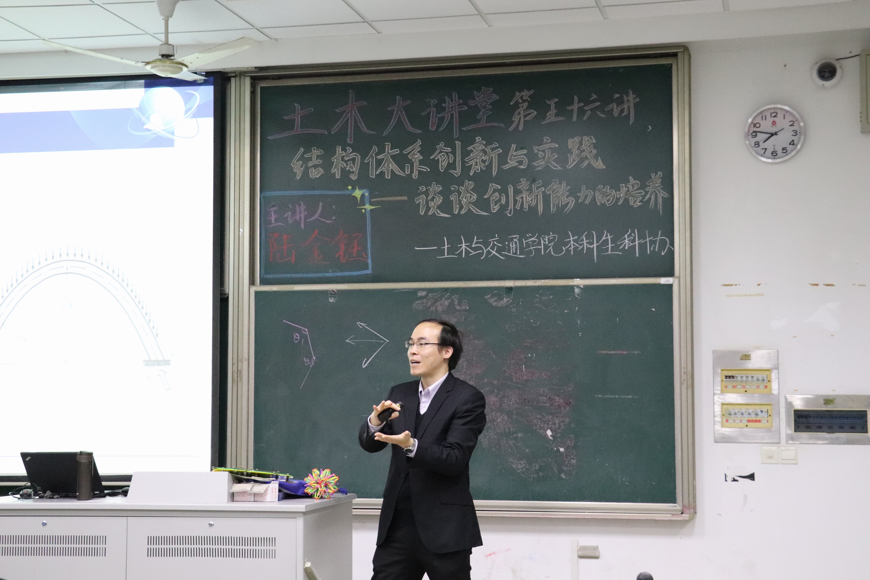 首先,陆教授介绍了东南大学在学生创新培养方面的概况,重点介绍了“课堂导研—课题引研—竞赛拓研—工程强研”四位一体的培养模式和学生组织在创新方面“自主驱动”的运行机制。陆教授还展示了部分学生创新项目的成果,激发了同学们对结构创新的兴趣。