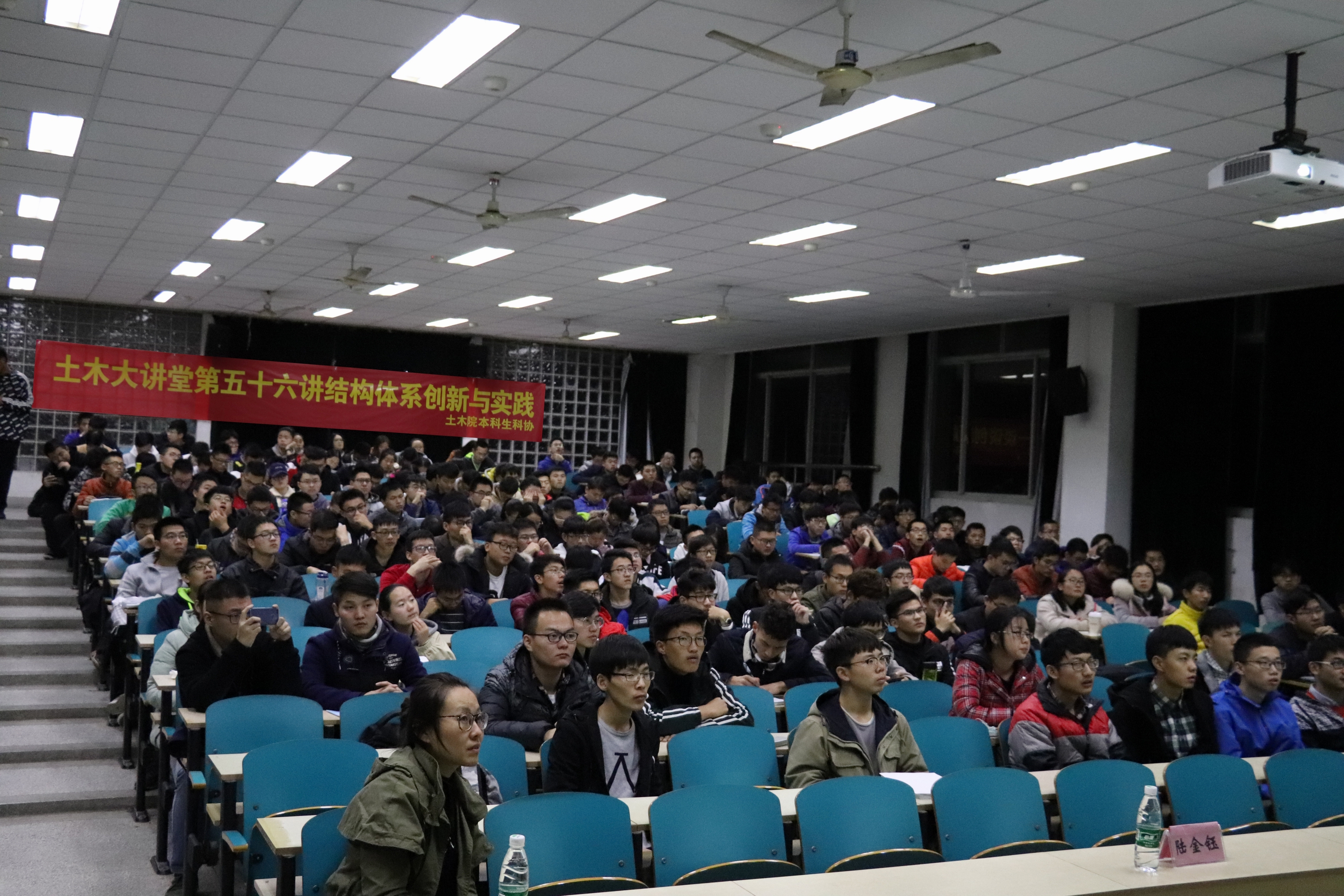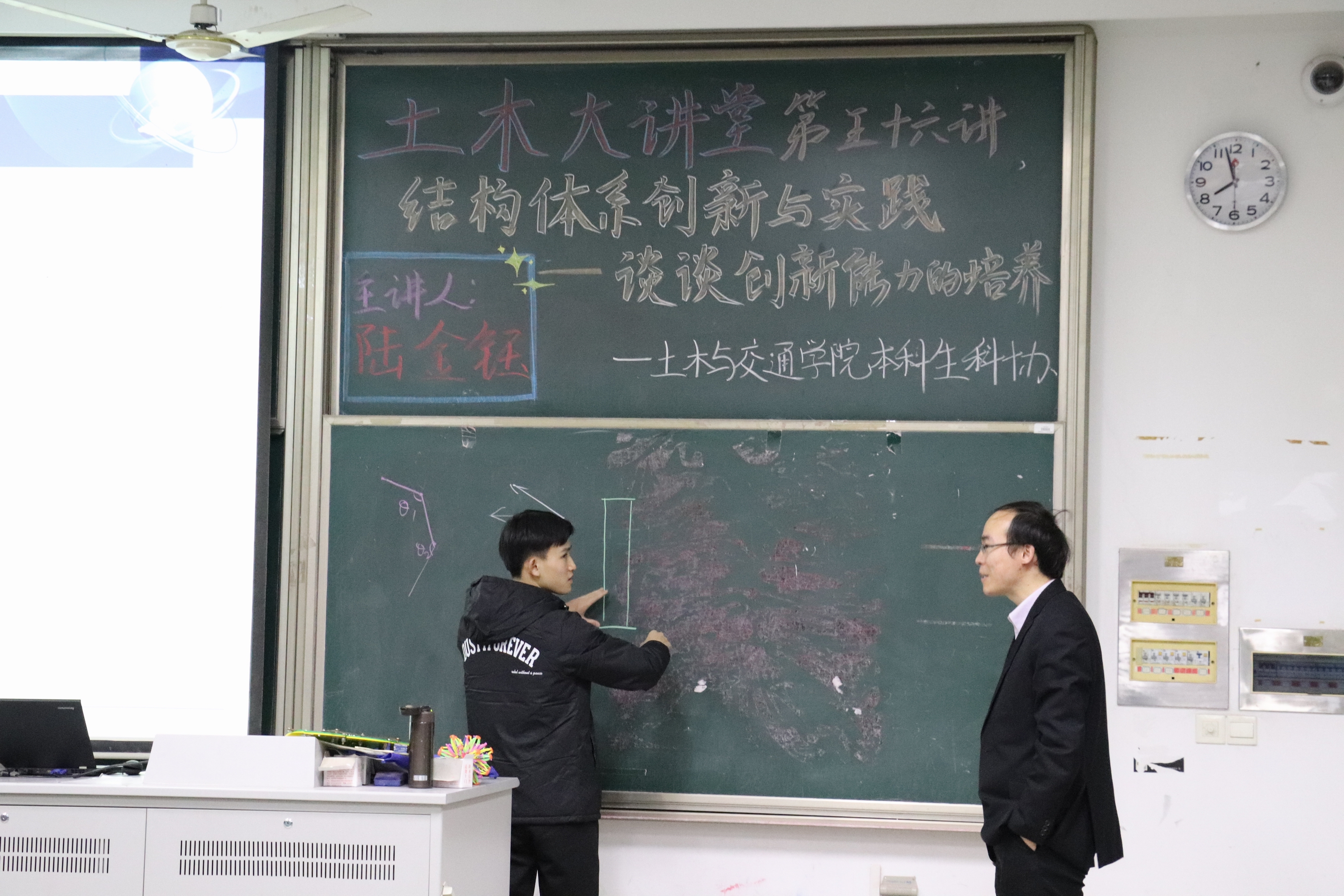 首先,陆教授介绍了东南大学在学生创新培养方面的概况,重点介绍了“课堂导研—课题引研—竞赛拓研—工程强研”四位一体的培养模式和学生组织在创新方面“自主驱动”的运行机制。陆教授还展示了部分学生创新项目的成果,激发了同学们对结构创新的兴趣。