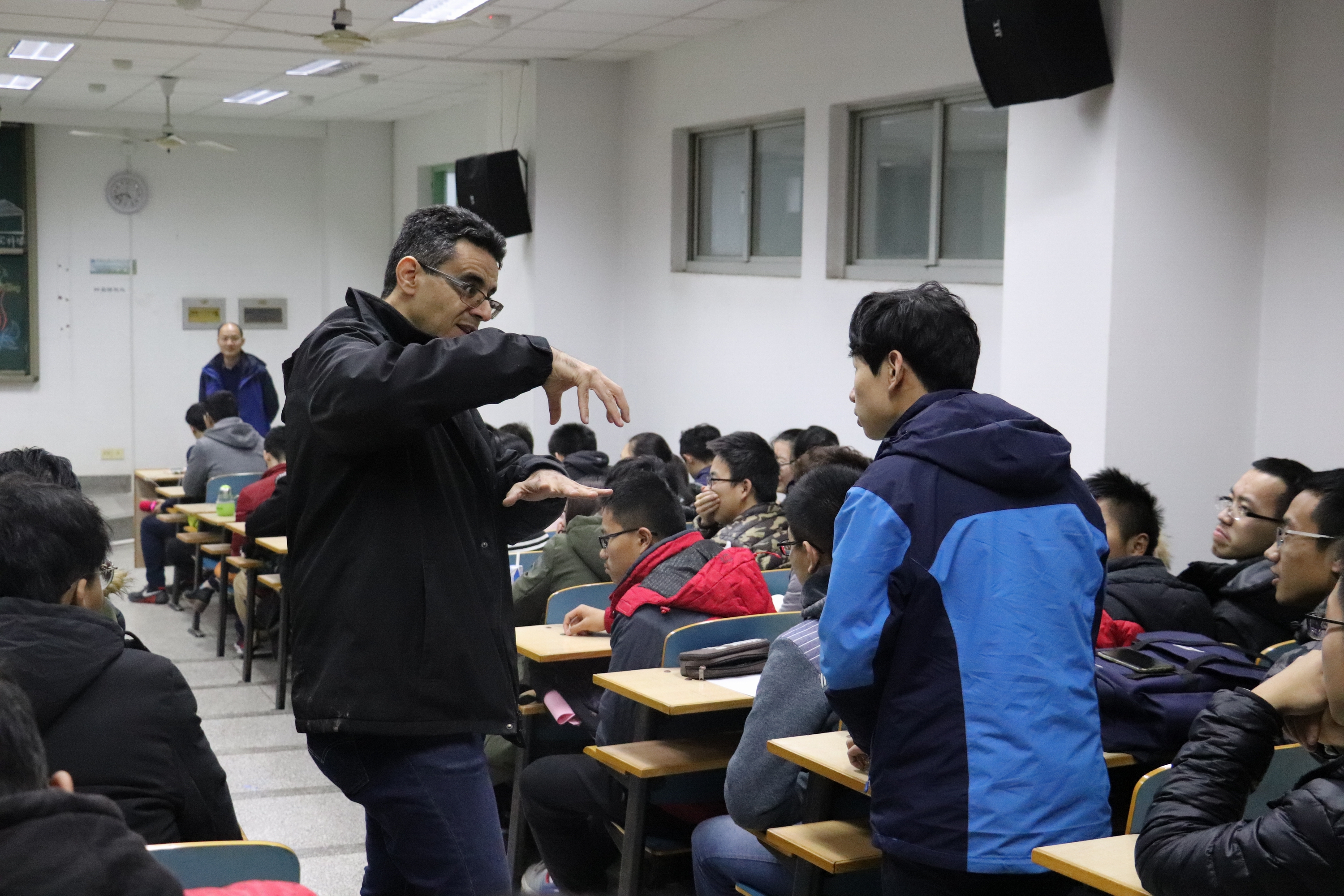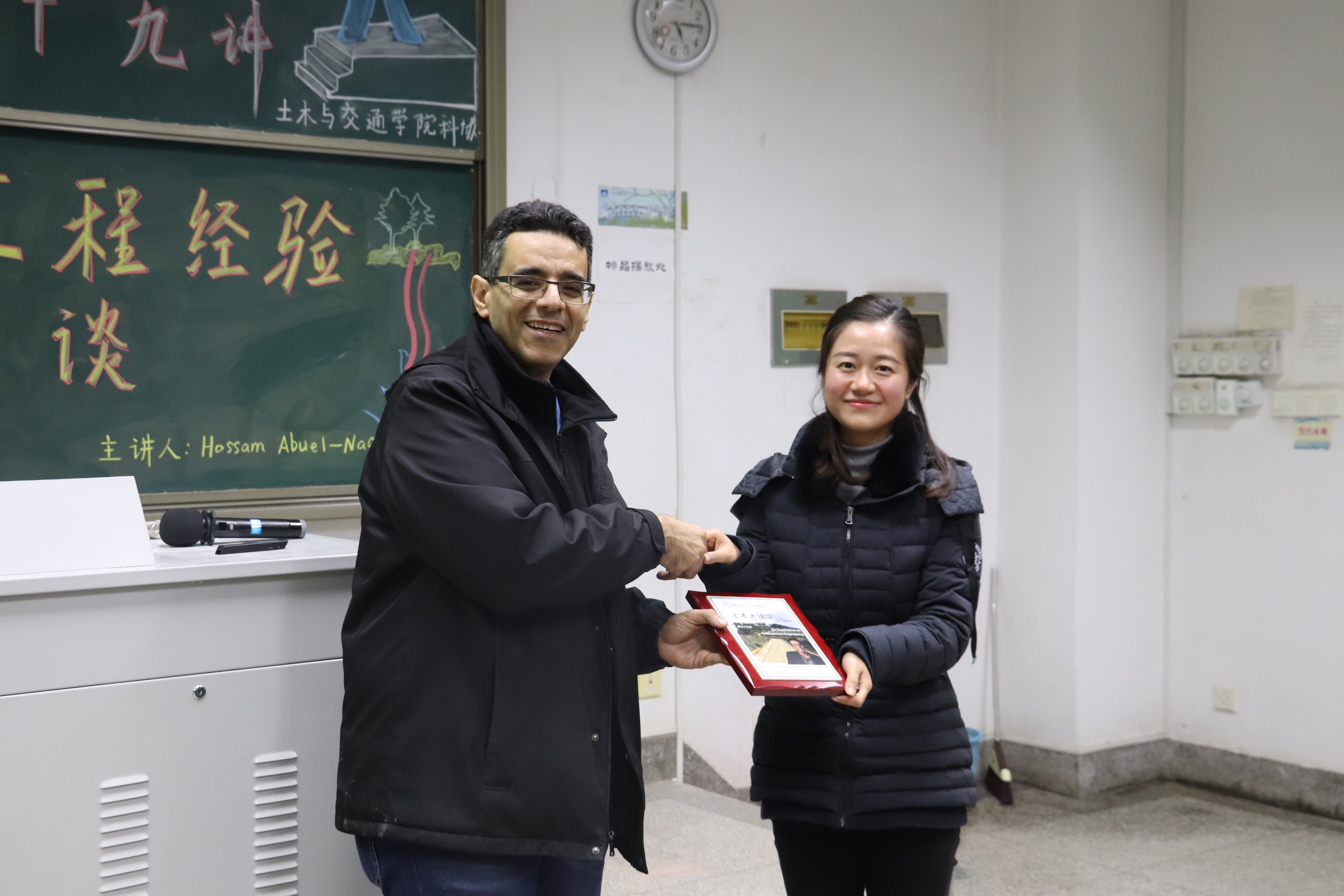 首先,Hossam教授用轻松诙谐的语言与同学们进行互动,引入本次讲堂的主题。接着,教授介绍了自己在岩土方面丰富的求学经历和工作经验,建议同学们在选择专业方向时,要将自己的兴趣作为主导因素。随后,教授以一个土壤与青草结合的卡通形象“soly”引出了要想利用好岩土,必须先了解土质,才能弥补弱点、强化优点的观点,并介绍了预加压等增强土质的方法、建筑物的加固措施以及临湖地界的防渗措施等内容。在互动环节中,同学们提问积极,Hossam教授耐心而详细地解答了同学们的问题。最后,陈明明老师向Hossam教授赠送土木大讲堂纪念牌。