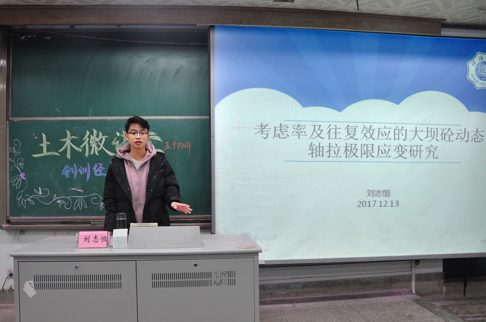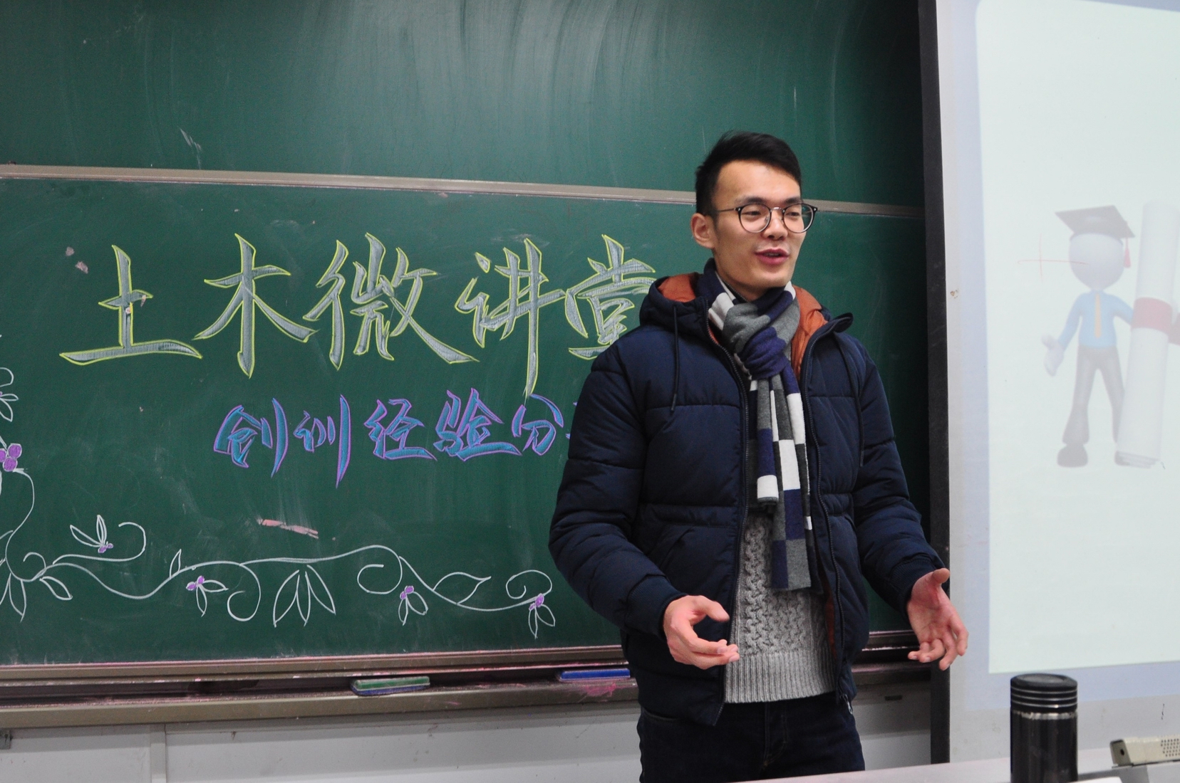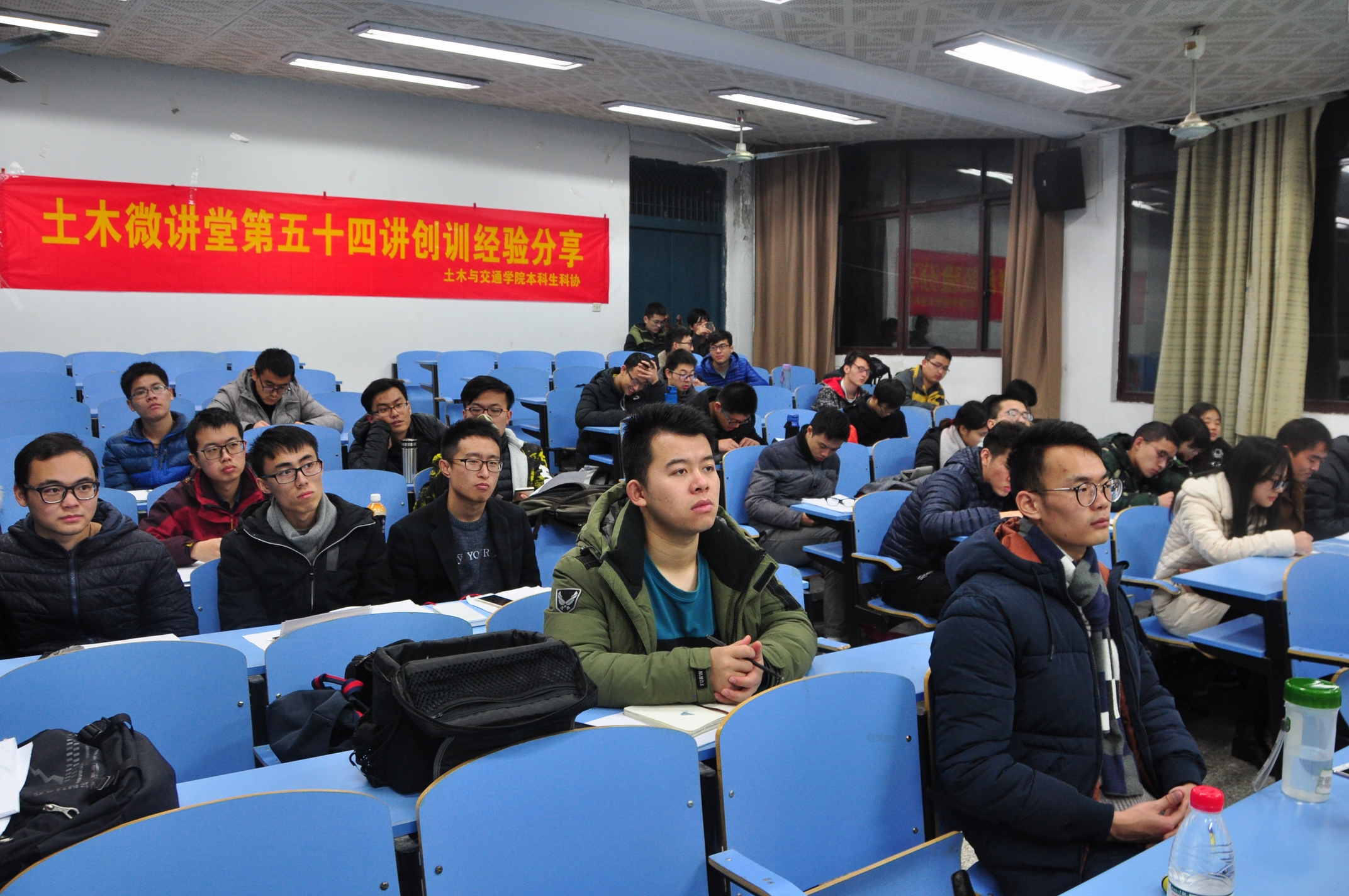 2017年12月15日下午6:30,由土木与交通学院主办,学院本科生科协承办的土木微讲堂第五十四讲之“创训经验分享”在河海大学校本部管理楼101室成功举办。本次讲座邀请到了2014级优秀学生王家超同学和刘志恒同学担任主讲人,两位同学在创训项目学习方面有着独到的经验。土木院2015级的部分同学聆听了本次讲座。
