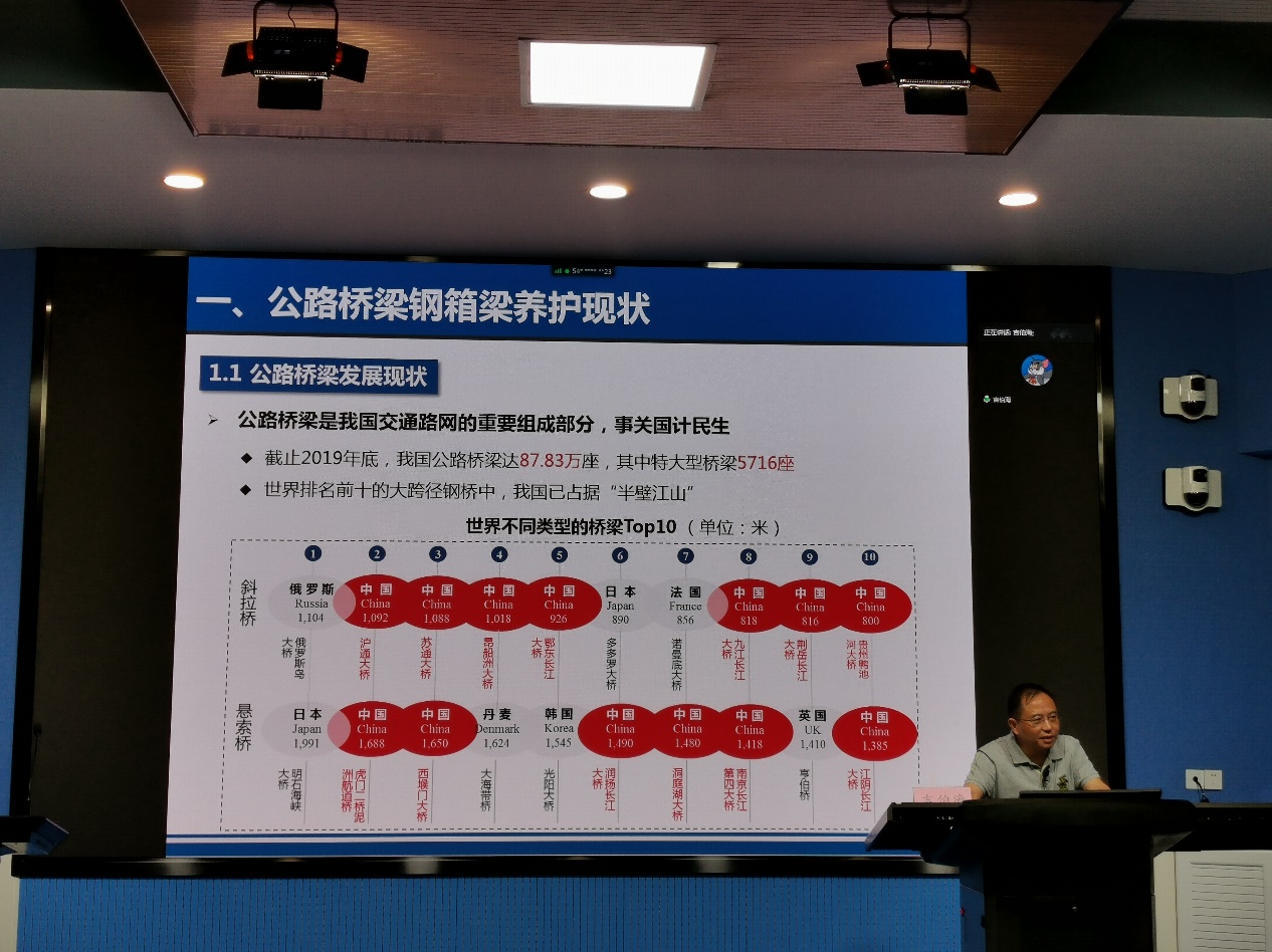 第一天的最后一位授课专家是河海大学吉伯海教授,他的授课题目是《公路桥梁钢箱梁养护技术与挑战》。吉教授介绍了我国公路桥梁的发展现状,指出钢箱梁疲劳问题已经成为大跨公路钢桥钢箱梁养护的关键瓶颈问题。由于桥梁养护与车辆畅行矛盾日益突出,检测评估不准,导致难以及时发现裂纹并科学制定养护策略。吉教授从疲劳荷载特征、疲劳强度指标、裂纹扩展规律、耦合作用影响等四个方面对钢箱梁养护关键技术进行了理论研究,并向大家介绍了疲劳裂纹检测技术、裂纹评估方法、疲劳开裂预防技术、疲劳开裂修复技术等特色技术。同学们对吉教授的讲座反响热烈,提出了钢箱梁养护技术与现有的健康监测技术的区别等专业问题,吉教授也一一作了详细的解答,赢得了同学们的掌声。