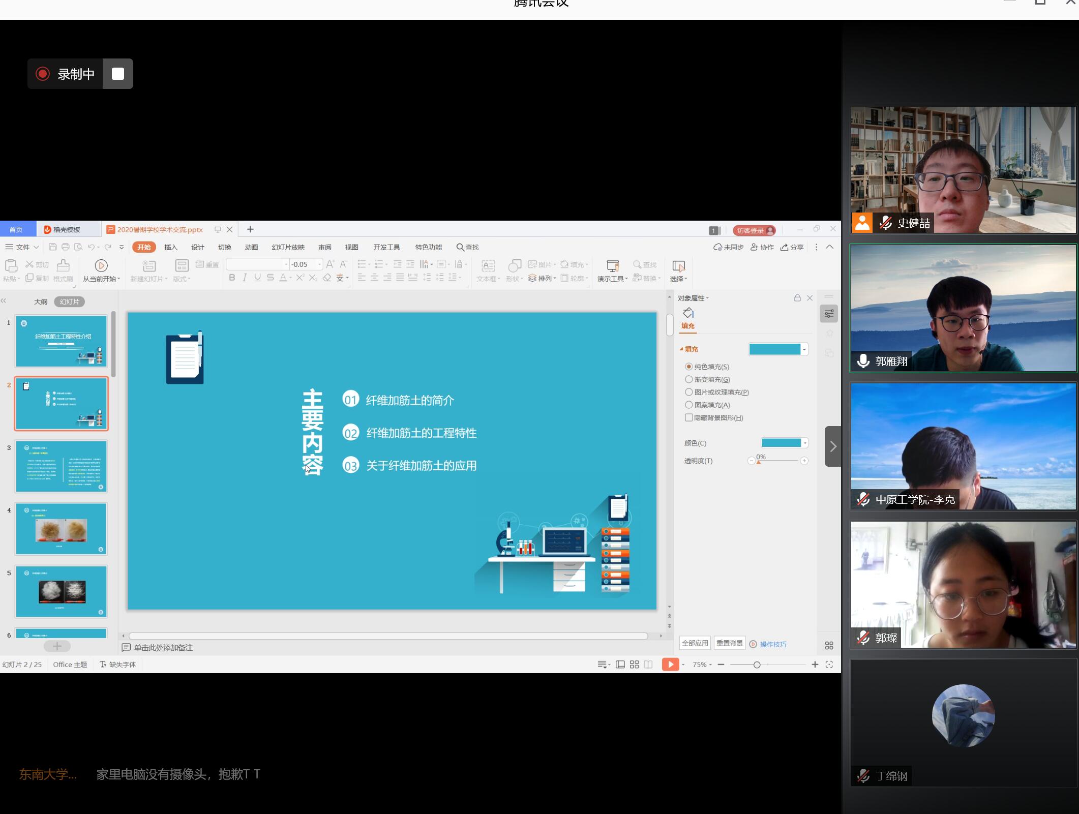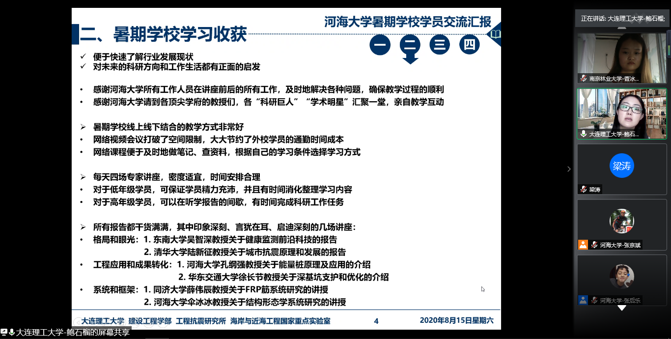 8月15日是2020年江苏省研究生“岩土工程与结构安全”暑期学校的第六天。今天是本次暑期学校专项活动“学员交流日”,经过连续四天的学术大餐,学员们在学海畅游、丰富自身的同时,也结识了各路志同道合的好友,本着“以文载道,以学会友”的精神,今日将舞台交给学员,在四个会场、共16场会议中,学员们纷纷上台进行了PPT汇报,踊跃发言,或是介绍自己的研究课题,或是分享自己的学习心得,或是介绍自己的学校专业等,大家进行了丰富多样的讨论,学员之间有了更进一步的了解。