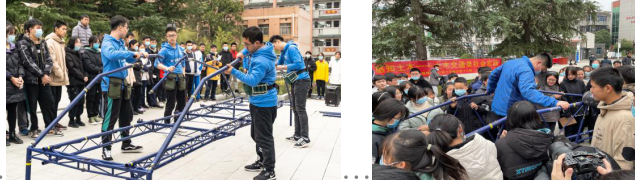 在钢桥拼装演示环节,实践小分队向中学生展示了钢桥模型的现场拼装过程,并同时介绍钢桥结构及材料的特点。拼装完成后,让中学生站在钢桥模型上体验结构承重的魅力。