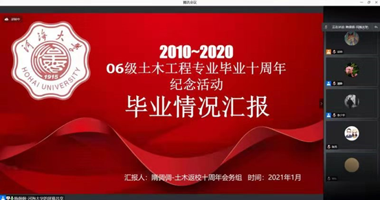 202012号,06级土木工程专业校友和学院师生们开展了毕业十周年纪念活动。目前,多地疫情散发,也丝毫不能阻挡校友们相聚的热情,为响应学校疫情防控的要求,原精细筹备在河海校园内举行的06级土木专业毕业十周年纪念活动以另一种特殊的方式举行——线上云聚会。此次会议由院党委潘静副书记主持,学院院长高玉峰教授、副院长周继凯教授、副院长刘云副教授、曹平周老师(06级分管教学副院长),杨天老师(06级辅导员)、韦芳芳老师(班导师),聂丽英老师(班导师),孙少锐老师(班导师),陈礼和老师(班导师),王伟老师(班导师),周云东老师(土力学),沈德建老师(土木工程导论),郑苏娟老师(高数),吴跃东老师(地基处理),卢漫老师(素描),蒋勇老师,汤茂买老师,张洁老师以及06级校友代表和17级学生志愿者共同参与了本次会议。