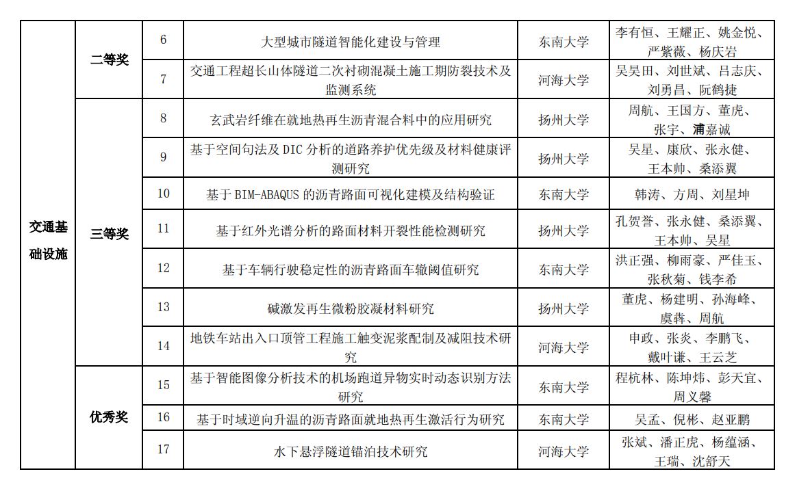 其中我校周建坤、王曌亚、胡欢、粟海琪、葛忠智同学共同完成的《考虑联合运输的多模式城市交通网络容量模型及实证研究》(指导老师:土木院杜牧青)项目获得交通工程系统类二等奖。吴昊田、刘世斌、吕志庆、刘勇昌、阮鹤捷共同完成的《交通工程超长山体隧道二次衬砌混凝土施工期防裂技术及监测系统》(指导老师:土木院赵海涛、 陈硕)项目获得交通基础设施类二等奖。申政、张炎、李鹏飞、戴叶谦、王云芝同学共同完成的《地铁车站出入口顶管工程施工触变泥浆配制及减阻技术研究》(指导老师:土木院闵凡路)项目获得交通基础设施类三等奖。张斌、潘正虎、杨蕴涵、王瑞、沈舒天同学共同完成的《水下悬浮隧道锚泊技术研究》(指导老师:港航院连宇顺)获得交通基础设施类优秀奖。