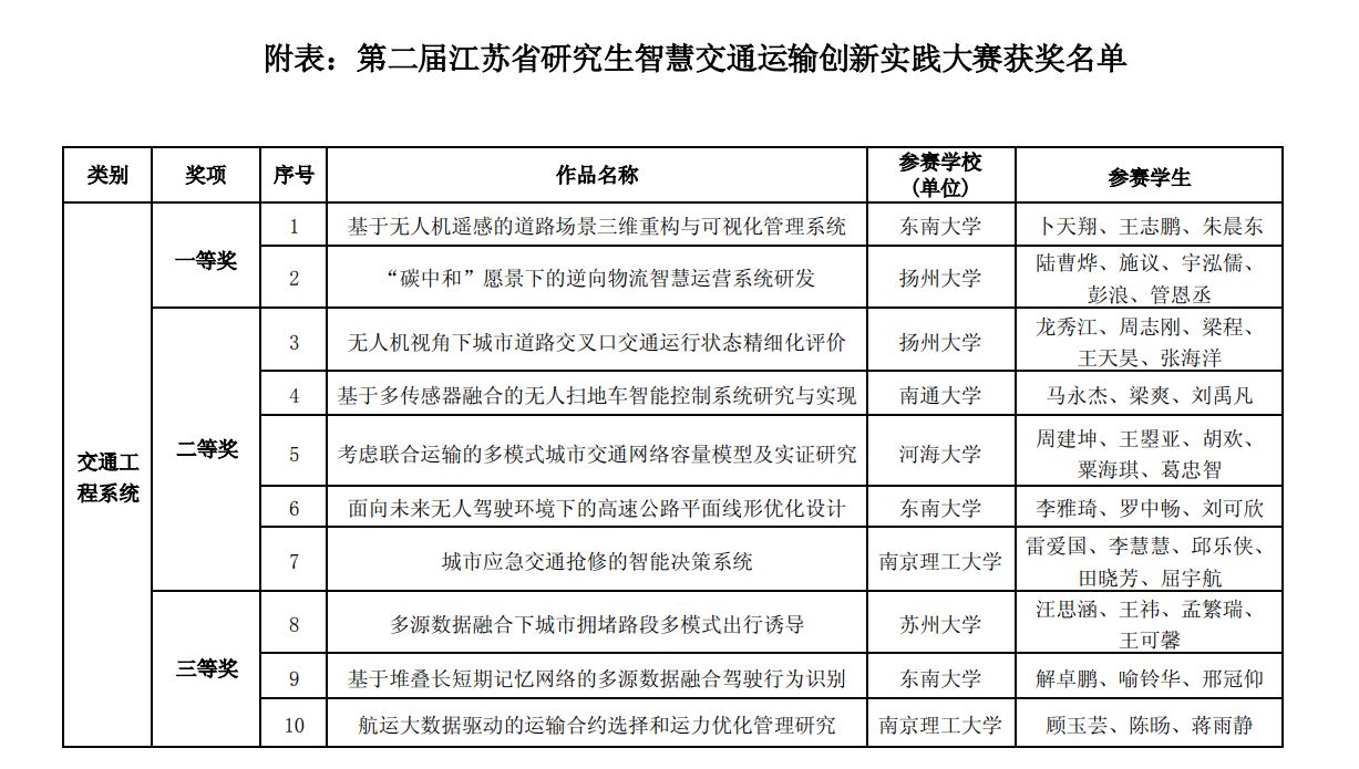 本次大赛在国家“交通强国”国家战略的指引下,以“绿色安全、智慧创新”为主题,服务经济社会发展需要,强化江苏省交通运输及相关交叉学科领域的研究生创新能力培养,促进“产学研”深度融合,为研究生提供了沟通交流的平台和科研成果展示的机会。期待未来的日子里,我校学子继续紧跟时代发展前沿,拼搏奋进、再创佳绩!
