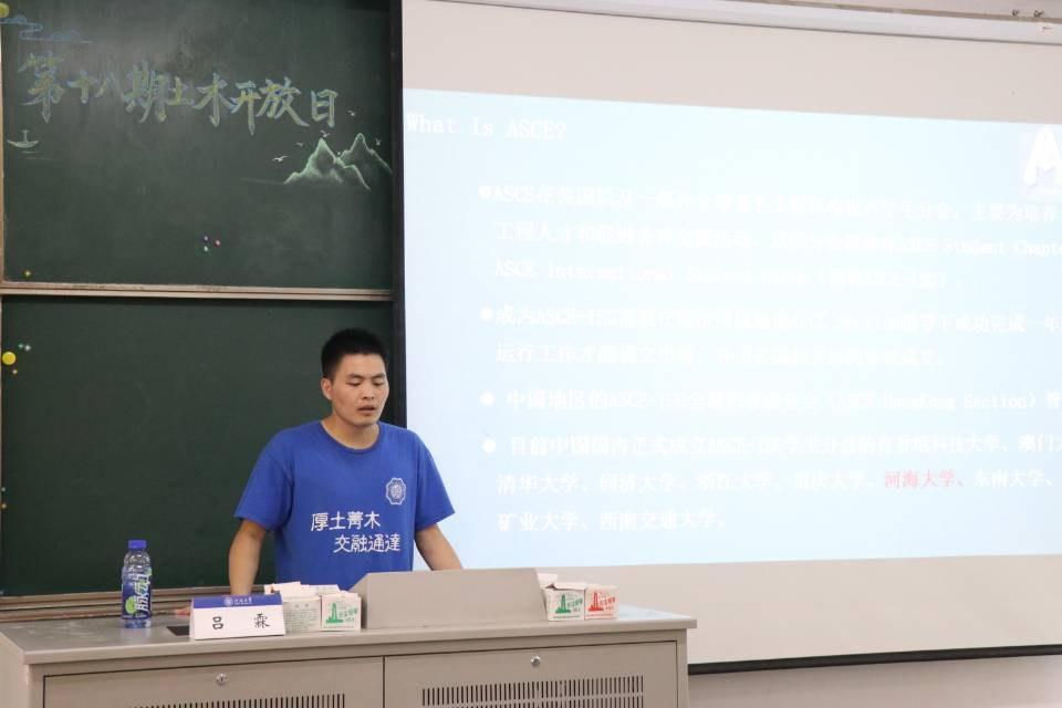 志愿者在北教201教室为同学们详细介绍ASCE河海大学分会的基本情况和美国大学生土木工程竞赛的相关参赛经历。志愿者的介绍从回溯历史到展望未来,从课本理论到工程实际,深入浅出,让同学们深刻了解了ASCE河海大学分会的组成、历史、工作内容等相关情况,同时也让同学们对ASCE河海大学分会产生了浓厚的兴趣与憧憬,激发了对专业学习和将来参加美赛的热情。