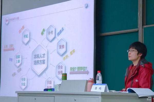 紧接着,在对学业环节的讲解过程中,陈老师向同学们重点解读了本科生人才培养方案的要求,包括考试、选课、专业分流的环节,以及在学业未能达标的情况下进行补考、重修、学业预警、学籍处理等方面。通过陈老师细致地讲解,同学们明白了大学学习生活中严格按照学业环节进行学习的重要性与必要性。