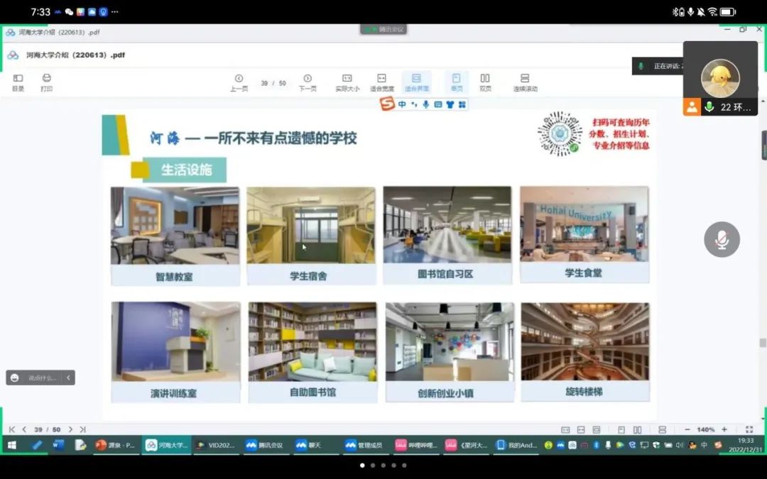 2022年12月31日,为感谢母校培育之恩,实践团队负责人土木院鲁乔丹与团队成员大禹院杨文橦、赵奕凡、外语院卢小旭、环境院鲍瑞以线上宣讲形式向高中母校开展“源泉工程”系列宣讲活动,宣传河海大学的优秀学风和教育培养理念,为高中学子们解答学习疑惑。
