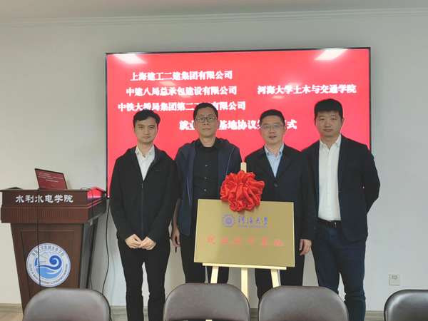 在与会人员的共同见证下,水电院与海南省水利水电勘测设计研究院有限公司、中电建安徽勘测设计有限公司、中铁七局集团南京工程有限公司,土木院与中铁大桥局二公司、中建八局总承包公司江苏分公司、上海建工二建集团共同签订了合作协议并为“就业实习基地”揭牌。