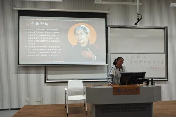 最后,吴乐蕊同学作为主讲人,分享了“敦煌的女儿”樊锦诗的感人故事。面对身体的不适和环境的挑战,樊锦诗没有退缩,而是坚定地扎根在大漠之中,守护着敦煌文化,让莫高窟的精髓得以传承。她将大部分心血投入到了莫高窟的保护和修复工作中,用实际行动彰显了真正的“匠人精神”。她的坚持和不畏艰辛的精神也深深感染了在场的同学们。除此之外,在她传承莫高窟文化的过程中,同学们也认识到了在遗迹保护中改革创新的重要性。