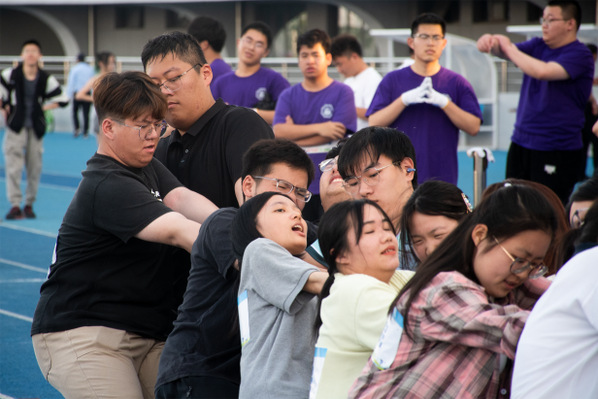 由于本项目以所有人双腿连成的最大长度为指标,故在比赛开始前,队员们活动身体,以使双腿相连的长度达到最大。在赛中全力以赴的同时,同学们紧咬牙关,拉伸身体,这是身体的考验,更是意志的挑战。在这个过程中,同学们会感受到意志的作用,更领会到以后无论面对什么风险挑战,都要以坚韧的意志迎头而上。
