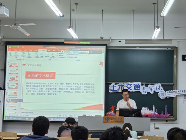 随后,主讲人龙飞旭同学为大家讲述了胡适的故事,分别从文坛中的胡适和政坛中的胡适两个方面展开细致的介绍。胡适是新文化运动的重要发起人之一,他在中国大力传播民主与科学思想,并倡导白话文取代文言文,促进了国民素质的提高。在胡适的故事中,同学们看到了胡适身上的怀疑精神和科学精神的重要性,包括追求知识和真理的勇气、批判性思维和独立思考的能力、包容和开放的心态以及责任感和担当精神,相信会对同学们的未来产生深刻影响。