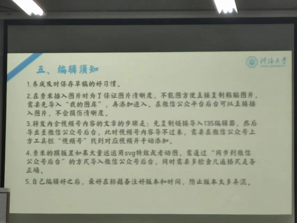 然后龚同学指出了推送排版相关注意事项,如文字的协调性、配色的符合度、布局的合理性、快捷方式的使用等。除此之外,龚同学还将所有的注意事项整理在册,制成了编辑须知方便大家记录与参考。