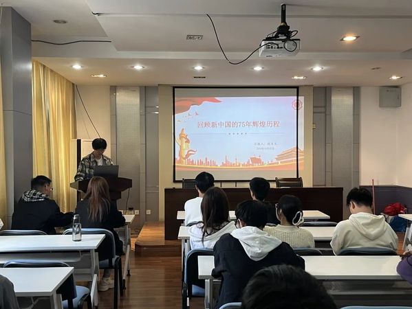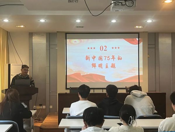 土木与交通学院研究生会主席团成员程乐文同学给同学们作了“回顾新中国的75年辉煌历程”的相关报告。程乐文同学从中国特色社会主义的开创、经济成就的飞跃、社会进步的实质改善三个方面展开,向同学们介绍了新中国成立75周年来的成就。新中国75年的历史是党和人民弥足珍贵的精神财富,为我们在新征程上以中国式现代化全面推进强国建设、民族复兴伟业提供了深刻的历史启迪。