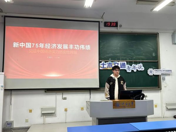 首先,主讲人王艺涵同学以新中国成立75周年以来经济发展的成就为主题,分别从经济增长的总体成就、工业农业产业现代化进程、贸易发展等方面详细叙述了在中国共产党的领导下中国经济发展至今的巨大变化。从曾经的贫穷落后到如今的世界第二大经济体;从改革开放到加入世界贸易组织,凸显了中国对外贸易的繁荣发展。不仅让同学们认知到了中国经济发展的成就斐然,更是激发了同学们的民族自豪感和为国家奋斗的使命感。
