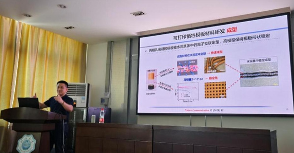 讲座中,董教授围绕“仿生混凝土设计理念与实现方法”展开深入阐述。首先,他回顾了滨海基础设施中混凝土材料的发展历程,分析了当前面临的氯离子诱发钢筋锈蚀、混凝土性能劣化等挑战,强调这些问题导致重大经济损失和安全风险,亟需新型防护技术。接着,结合自身在固体废弃物资源化和绿色建筑材料领域的丰富研究经验,以及团队的最新科研成果,分享了一系列独到的见解和创新性的研究思路。例如,在氯离子靶向抑制技术方面,董必钦教授提出了仿生人体循环系统的设计理念,通过构建混凝土三维管路传输网络和嵌入式3D打印方法,发明可打印、易成型、自消除的管路模板材料,实现了氯离子的靶向识别与抑制。这一创新方法解决了传统防护措施修复功能单一、防护周期有限的问题,为滨海混凝土结构的可持续运维提供了全新理论参考和技术支撑,内容引起了在场师生的浓厚兴趣。